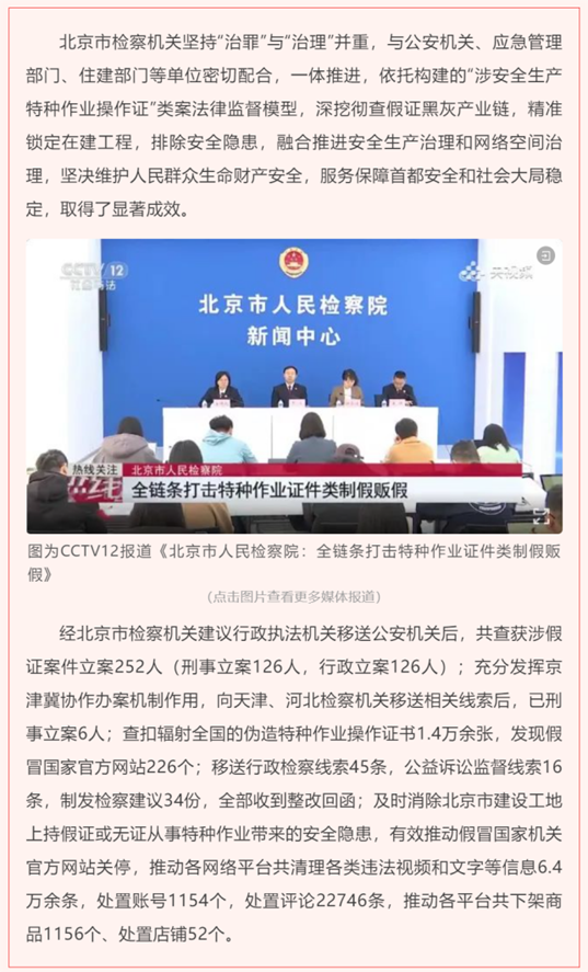 3月8日,最高人民检察院党组书记、检察长应勇在第十四届全国人民代表大会第二次会议上作最高人民检察院工报告,报告中着重提到关键词特种作业假操作证溯源治理工作及成效。据报告显示,北京检察机关深挖办案中发现的涉及上万张特种作业假操作证问题,推动查办制贩假证人员126人,督促主管部门落实监管责任,溯源整治假冒国家机关官方网站226个。