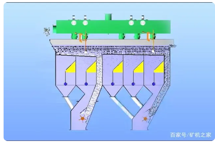 在筛板上的已经按相对密度分层的煤和矸石,受到冲水的作用,逐渐向跳汰机的排料端移动,当到达矸石段的排料阀门时,矸石就经阀门排入机箱,再由矸石提升斗排到机体外。上层的中煤和精煤则在冲水作用下越过溢流堰,进入跳汰机的第二段(中煤段)。在中煤段,中煤和精煤在脉动水流及冲水双重作用下,一方面继续分层,另一方面继续向第二段排料端移动,当到达中煤排料阀门时,中煤又经过阀门排入中煤段机箱内,再经中煤提升斗排到机体外。精煤则越过中煤段的溢流堰随水流出跳汰机,经溜槽至脱水筛进一步脱水。完成跳汰选煤。