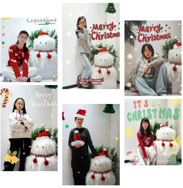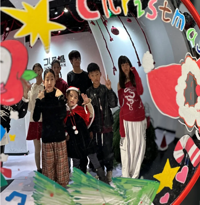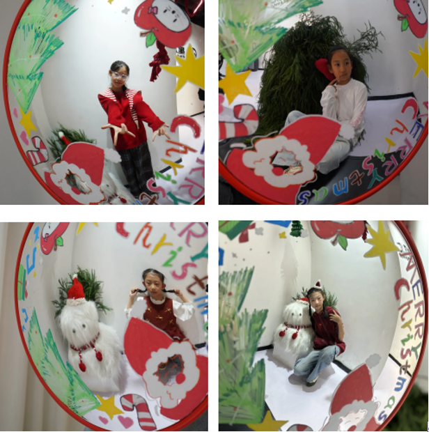 圣诞主题的哈哈镜成了现场的“快乐焦点”,镜面上手绘的圣诞袜、圣诞树、Merry Christmas字样,与变形后的童趣画面相映成趣。孩子们凑到镜前,看着镜中或高或矮、或胖或瘦的自己,忍不住哈哈大笑,有的对着镜子比出可爱的剪刀手,有的模仿起模特课堂上学到的专业pose,镜头抓拍下的每一个搞怪表情,都成了圣诞最鲜活的纪念。
