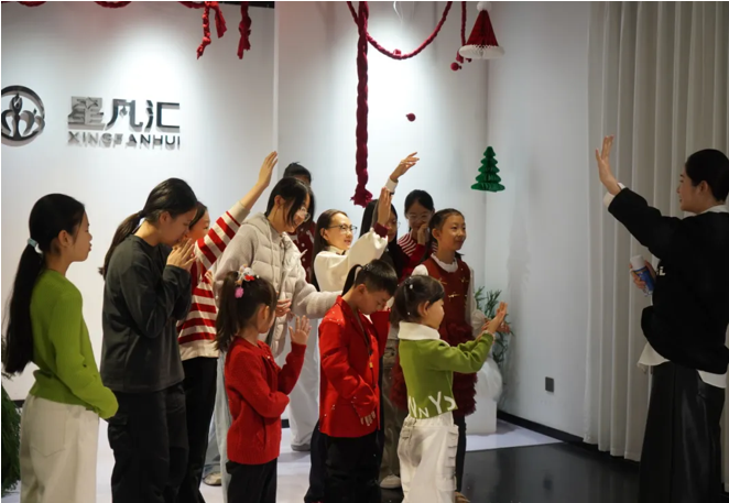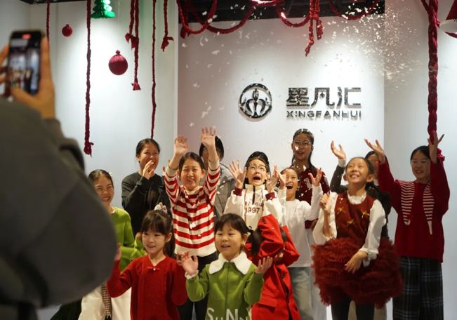 活动的最后,所有孩子齐聚在印有星凡汇logo的背景墙前,穿着圣诞色系的服装,有的比出胜利的手势,有的高高举起双手,还有的搂着身边的小伙伴,在欢声笑语中留下了温馨的集体大合照。这张合照不仅记录了孩子们的快乐瞬间,更凝聚了本次圣诞美育活动的美好回忆。