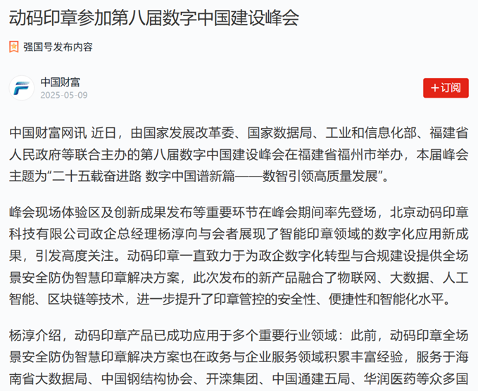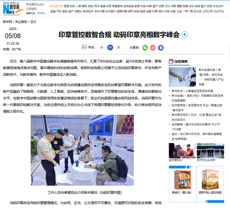 第八届数字中国建设峰会在福建省福州市举行,汇聚了800余位企业家、超100名院士专家,聚焦数据领域堵点难点问题,展示硬核科技和创新成果。矩网科技有限公司携子公司动码印章参会,并发布新产品新技术,为数字福州、数字中国建设注入新动能。动码印章获新华网、央广网、学习强国平台、人民政协网等多家媒体及中国防伪行业协会、中国安防协会、河南省数字经济产业协会公众号关注报道。