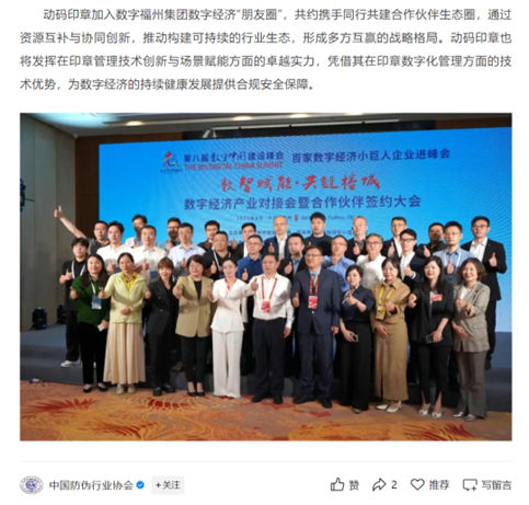 动码印章作为专业的全场景安全防伪智慧印章解决方案提供商,加入数字福州集团数字经济“朋友圈”,共约携手同行共建合作伙伴生态圈,通过资源互补与协同创新,推动构建可持续的行业生态,形成多方互赢的战略格局。动码印章也将发挥在印章管理技术创新与场景赋能方面的卓越实力,凭借其在印章数字化管理方面的技术优势,为数字经济的持续健康发展提供合规安全保障。