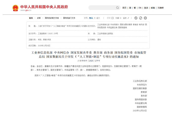近日,工业和信息化部、中央网信办、国家发展改革委、国务院国资委、市场监管总局、国家数据局等八部门联合印发《“人工智能+制造”专项行动实施意见》(以下简称《意见》)。