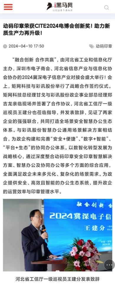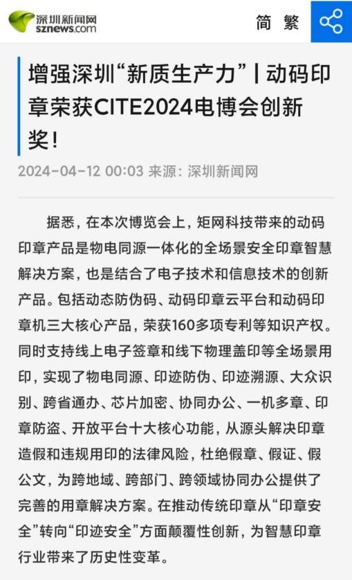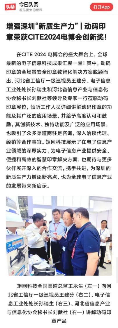 4月9日—11日,由工业和信息化部与深圳市人民政府联手打造、以“追求卓越,数创未来”为主题的国家级电子信息全产业链展示平台——CITE2024第十二届中国电子信息博览会(以下简称“电博会”)在深圳会展中心(福田)隆重召开。矩网科技有限公司(以下简称“矩网科技”)由河北省信息产业与信息化协会带队参展。矩网科技总经理甘戈一行携动码印章产品及技术,带来前瞻性的印章技术展示,动码印章因其杰出的技术实力和创新性成果,荣获“第十二届中国电子信息博览会创新奖”。