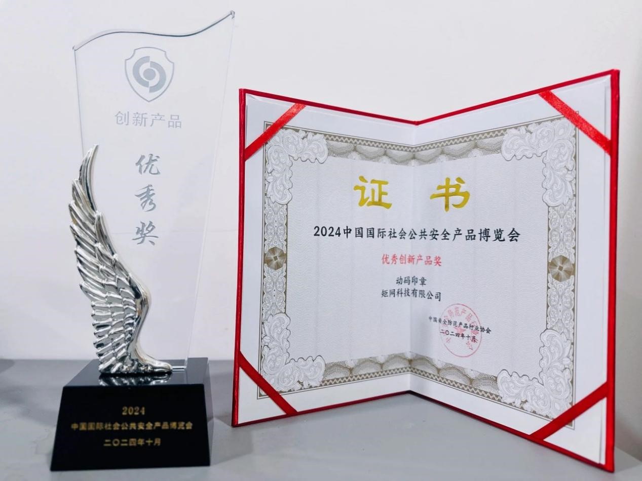 由中国安全防范产品行业协会主办的2024中国国际社会公共安全产品博览会暨智能与安全产业发展大会(以下简称安博会)10月22日在北京盛大开幕!矩网科技作为智能印章领域的领军企业,受邀携自主研发划时代的物电同源一体化智慧印章解决方案“动码印章”参与本次展会。动码印章系列产品凭借卓越的动态防伪技术成为展会亮点,一举斩获“优秀创新产品奖”,不仅展现了矩网科技在智能印章领域的深厚积累与前沿探索,更为我国安防行业树立了新的标杆。